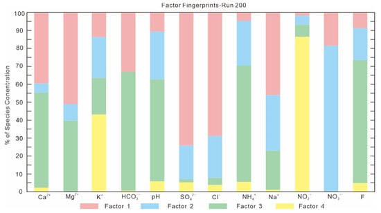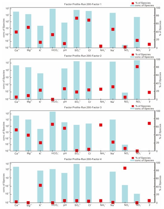 Quantitative insights regarding the sources of diverse terraform elements can be derived through PMF [7]. Building on previous hydrogeological investigations and the literature, this study anticipates three to five potential pollution sources in the study area. In the model implementation, the number of factors was set to 3, 4, and 5, respectively, with 200 iterations per setting. When the number of factors was set to 4, the difference between the q-robust and q-true values was minimized, and the residuals were predominantly in the range of −3 to 3. A strong correlation was observed between the measured and predicted values of water chemistry. This indicates that setting the number of factors to 4 in the PMF model can effectively extract the information embedded in the original data [21]. The results of the quality parameters’ factor profiles for the groundwater of the Hexian area are presented in Figure 4 and Figure 5. Elements with factor loading contributions ≥30% were classified as originating from the same source [22].