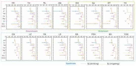 Water quality assessments against drinking (Sj(drinking)) and irrigation (Sj(irrigating)) standards reveal significant exceedance risks in specific regions. For potable use, Cl− concentrations in mid-reach Qianjiang (maximum 1071.96 mg/L) and SO42− in upstream Luzhou (maximum 1339 mg/L) exceeded the drinking water limits by three to five times, respectively, posing potential health risks to local populations. In terms of irrigation suitability, downstream Hexian (mean HCO3− 361.95 mg/L) and mid-reach Qianjiang (mean HCO3− 710.73 mg/L) approached or exceeded the irrigation threshold (900 mg/L), indicating that long-term irrigation could induce soil salinization. Additionally, the upstream Yushu-Ganzi-Xianshuihe segment exhibited elevated Na+ (mean 206.02 mg/L) and SO42− (maximum 1339 mg/L), exceeding both drinking water (200 mg/L) and irrigation (1000 mg/L) standards, necessitating caution regarding salt accumulation and potential crop toxicity effects.