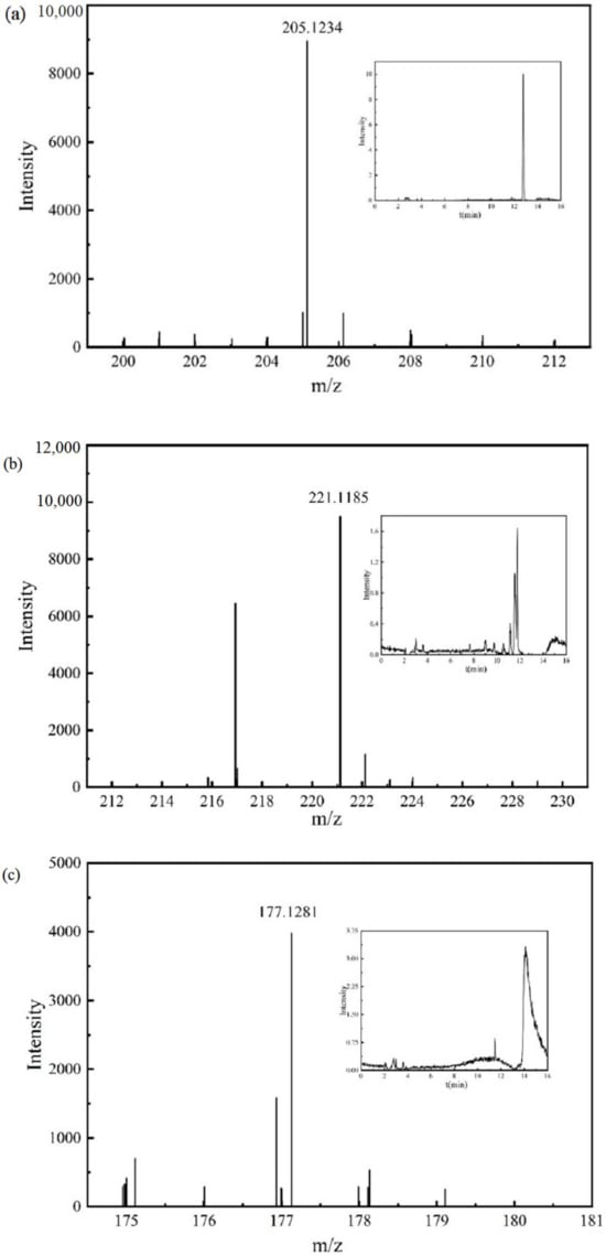 The chromatograms and mass spectra of the IBF molecule and its intermediate products in the detection results are shown in Figure 6.