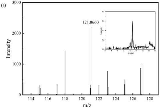 The mass spectrum and chromatogram of intermediate product P6 are shown in Figure 7a. Its molecular formula was C8H10O, the theoretical m/z was 121.0659, the detection m/z was 121.0660, and the retention time was 8.295 min. It may further undergo a ring-opening reaction at the position of the hydroxyl group.