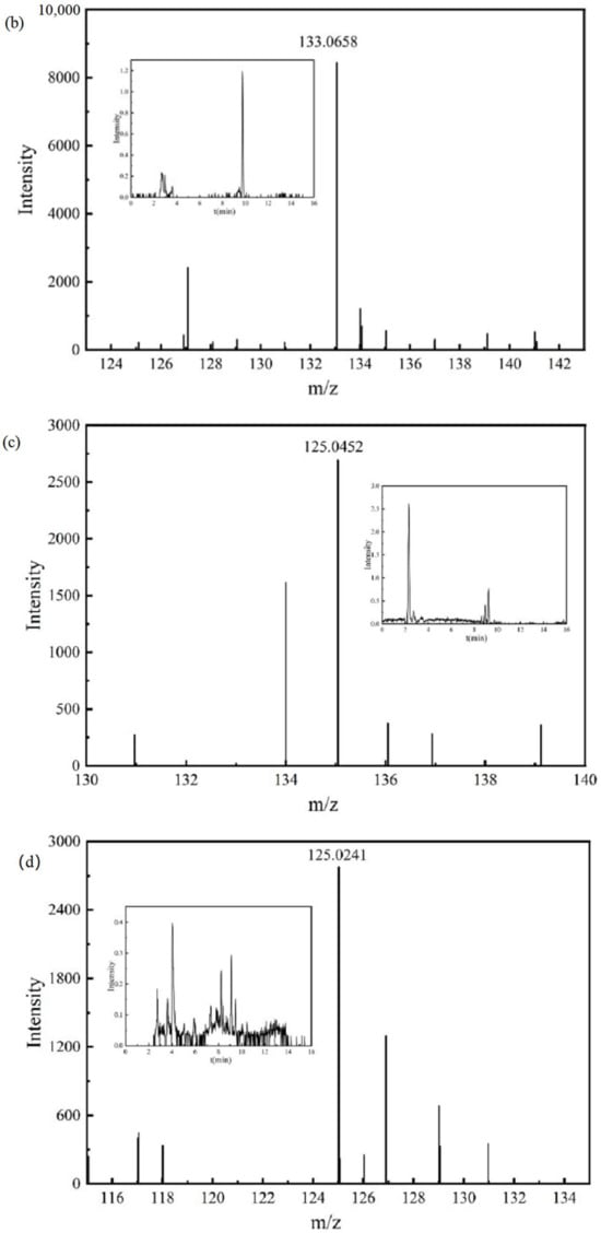The mass spectrum and chromatogram of intermediate product P9 are shown in Figure 7d. The molecular formula was C6H6O3, the theoretical m/z was 125.0244, the detection m/z was 125.0241, and the retention time was 4.056 min. It may undergo ring-opening reaction sat the positions of the three hydroxyl groups.