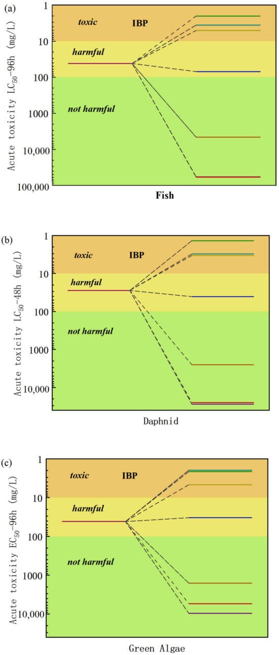 Acute and chronic toxicities of IBF and its intermediate products to fish, daphnia, and green algae: (a) acute toxicity LC50—96 h assessment, (b) assessment of acute toxicity LC50—48 h, (c) acute toxicity LC50—96 h assessment, (d) assessment of chronic toxicity to fish, (e) assessment of chronic toxicity to daphnia, (f) assessment of chronic toxicity to green algae.