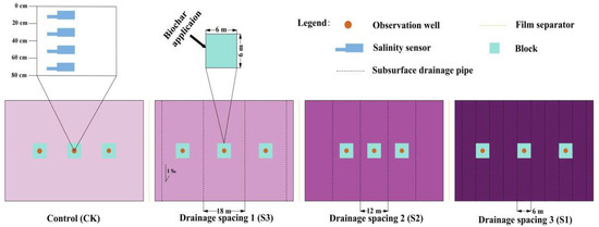 The experiment uses a split-plot design, with the four pipe spacings corresponding to four experimental blocks. Each block has an area of 60 m × 40 m. A 60 cm deep isolation membrane separates the blocks. Within each block, three 6 m × 6 m subplots are designated for applying the three different biochar rates. The subplots are located in the center between two adjacent drainage pipes. Each treatment is repeated three times, totaling 36 subplots. An observation point is set in the center of each subplot, as shown in Figure 1.