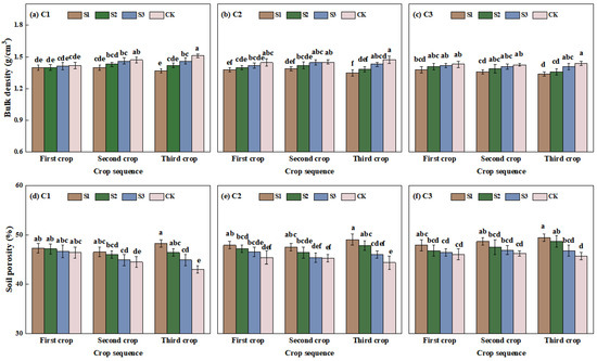 Effects of different spacing of drainage pipes and biochar amendment on bulk density (a–c), soil total porosity (d–f) in the plough layer (S1, S2, S3, and CK denote drainage pipe spacings of 6 m, 12 m, 18 m, and 0 m (no drainage pipes), respectively). C1, C2, and C3 represent 5, 10, and 15 t ha−1 biochar amendment rates, respectively. Different letter superscripts represent Duncan’s test groupings, and different superscripts denote statistically significant differences (p < 0.05). Values are means ± standard deviation (n = 3).