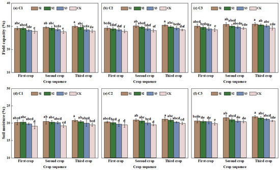 Effects of different spacing of drainage pipes and biochar amendment on soil water content at the field capacity (a–c) and soil moisture content of the plow layer (d–f) (the treatments comprised three subsurface drainage spacings (S1 = 6 m, S2 = 12 m, S3 = 18 m) and an undrained control (CK)), respectively. C1, C2, and C3 represent 5, 10, and 15 t ha−1 biochar amendment rates, respectively. Based on Duncan’s multiple range test, various letters (a–f) indicate notable differences at the 0.05 level. Values are means ± standard deviation (n = 3).