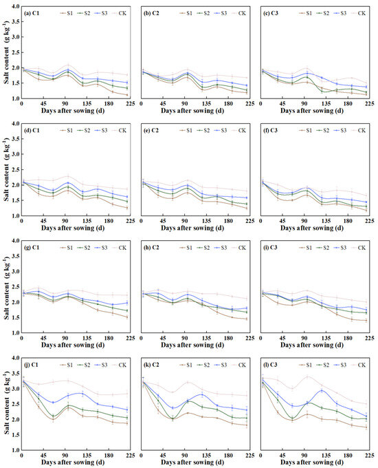 Soil salinity changes under different drainage pipe spacings and biochar applications (S1, S2, S3, and CK represent drainage pipe spacings of 6 m, 12 m, 18 m, and 0 m (no drainage pipe), respectively). C1, C2, and C3 represent 5, 10, and 15 t ha−1 biochar amendment rates, respectively. (a–c), (d–f), (g–i), (j–l) represent measurements at 0–20 cm, 20–40 cm, 40–60 cm, and 60–80 cm soil depths, respectively. Values are means ± standard deviation (n = 3).