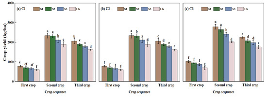 As the drainage pipe spacing decreased from S3 to S1, the alfalfa yields gradually increased (Figure 5). This pattern was observed under all biochar treatments, with significant increases (p < 0.05) in the second and third cuts. For the second and third cuts, the alfalfa yield in S1 was 10.7–18.5% higher than in S3, respectively. Compared to the control (CK), the drainage pipe treatment significantly improved the alfalfa yield, with increases of 10.6–47.4%.