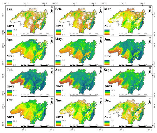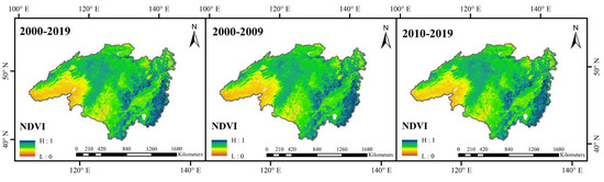 - Annual NDVI values were lowest in January, highest in July, and close to 0 in winter. Vegetation coverage was greatest in summer. Southern areas like SHR and the UssuriR had relatively higher NDVI values all year. Northern regions, like ErgunaR, were more climate restricted. From 2000 to 2019, vegetation growth markedly increased. The NDVI values were lower from 2000 to 2009, especially in the northern and central high altitudes, but rose significantly from 2010 to 2019, with a reduction in low-value areas and an expansion of high-value areas.