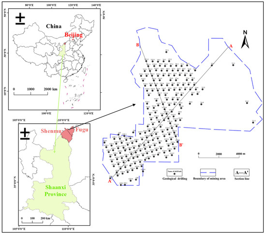 The Guojiawan coal mine is located in the Yushenfu mining area, which is the largest coal base in the Jurassic coalfield in northern Shaanxi, in the northern Ordos Basin. Deposition in a variety of mud–carbon depositional environments resulted in the formation of a stable and continuous thick coal seam (Figure 1) [23,24]. The main coal-bearing stratum in Guojiawan is the Yanan Formation in the Middle Jurassic system, and the main coal seam being mined at present is the No. 5-1 coal seam. It is 0.25–9.78 m thick, and has burial depths of 10–204 m. Measurement results have revealed that the development height of the water-conducting fissure zone after mining ranges from 26.88 to 328.61 m, with an average of 96.09 m, and it has the potential to spread to the aquifer at the surface and the Yanan Formation aquifer in some areas, which will pose a direct water-filling threat to safe mining of the No. 5-1 coal seam.