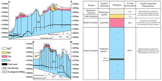 The water-bearing layer overlying the No. 5-1 coal seam in the study area is the water-bearing sandstone layer in the Yanan Formation, which has a strong water-bearing capacity. The Baode Formation is a red clay aquifer with a weak water-bearing capacity. The loess pore aquifer in the Middle Pleistocene Lishi Formation has a weak water-bearing capacity. The Holocene floodplain aquifer has a weak water-bearing capacity (Figure 2). In general, the terrain in the study area is low in the south and high in the north, and the aquifer water flows from north to south. The aquifer in the Quaternary system mainly receives recharge from precipitation, and there is a complementary relationship with the surface water. The outcrop area of the sandstone aquifer in the Yanan Formation receives recharge from precipitation, and part of it receives recharge from the aquifer in the Quaternary system.