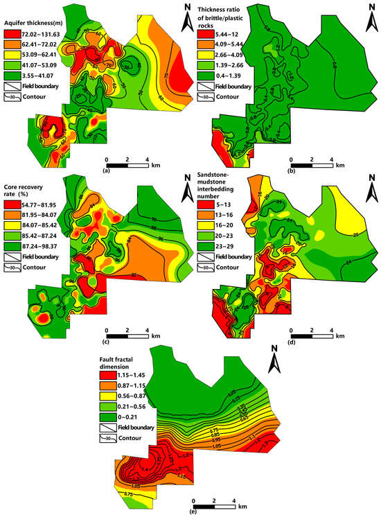 Contour plots of the main controlling factors. (a) is a contour map of the aquifer thickness; (b) is a contour map of the thickness ratio of brittle/plastic rocks; (c) is a contour map of the core recovery rate; (d) is a contour map of the sandstone-mudstone interbedding number; (e) is a contour map of the fault fractal dimension.