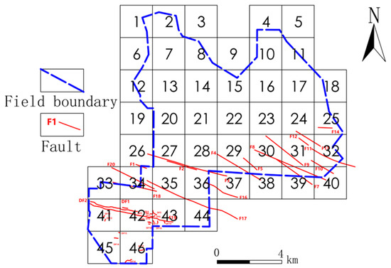 In this paper, the box dimension method is used, and the specific method steps are to cover the fixed scale wellfield area with a square grid of side length r = 2 km, divide the wellfield into 46 blocks, and count the number of square grids containing faults N(r). Varying the size of the grid side length r, square grids with r, r/2, r/4, and r/8 are utilized, and the number of square grids N(r) that have fault traces passing through them in the corresponding block section are counted. The relationship between the number of grids N(r) and the division of the square grid r by the corresponding level is such that N(r) and r satisfy the following power law relationship: