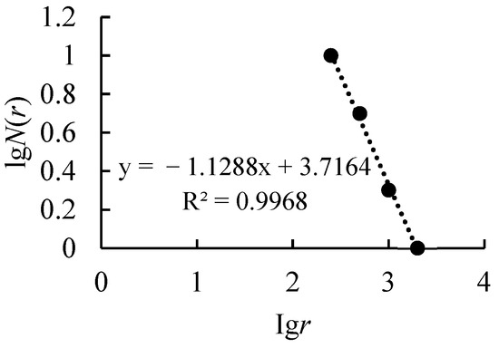 where lgN(r) is the number of square grids through which the logarithmically transformed fault trace passes, lga is a logarithmically transformed constant, and lgr is the logarithmically varying grid edge length.
