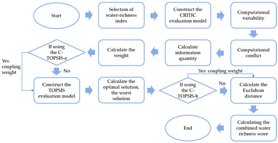 The CRITIC and TOPSIS methods are combined in two ways, namely, C-TOPSIS-a and C-TOPSIS-b. The specific computational flow (Figure 6) and computational steps are described below.