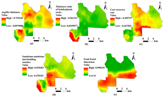 The thickness of the sandstone aquifer, the ratio of the brittle–plastic rock thickness, and the fault fractal dimension are positive indicators and are processed using Equation (3). The core recovery rate and the number of sandstone–mudstone interbeds are negative indicators and are processed using Equation (4). Single-factor normalized thematic maps are then generated (Figure 7).