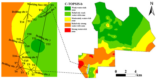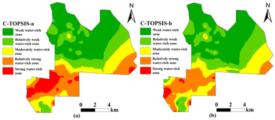 The water richness indicators were calculated using the C-TOPSIS-a and C-TOPSIS-b evaluation methods. The water abundance scores (Ci) were classified into five categories using the natural breaks classification method: weak water richness zone, relatively weak water abundance zone, moderate water abundance zone, relatively strong water abundance zone, and strong water abundance zone (Figure 9). The water richness of the roof sandstone in the main mining coal seam exhibits a general trend of stronger water richness in the southwestern part and weaker water richness in the northern region. The C-TOPSIS-a evaluation method involves superimposition of the indicator weights during the transition phase with the TOPSIS evaluation method, while the C-TOPSIS-b evaluation method directly incorporates the weights of the indicator factors into the internal TOPSIS framework, in which they participate in the Euclidean distance calculation. While the two methods exhibit certain discrepancies in their calculation results, they exhibit a high degree of similarity in the water richness zoning classification approach.