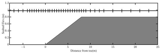 dt = 0.008 s. The bottom friction was parameterized using Manning’s coefficient, set to a value of 0.01. The model was executed for 60 wave periods, with the averaged results from the final five wave cycles used for data analysis.