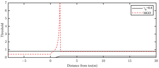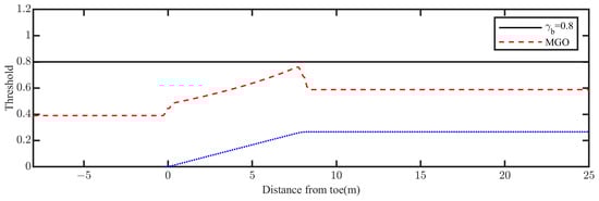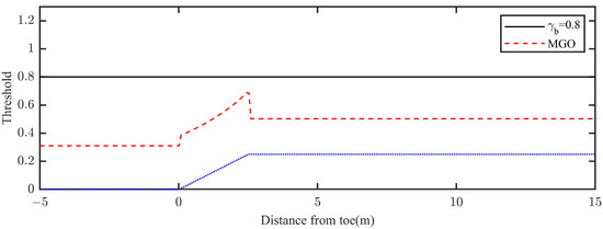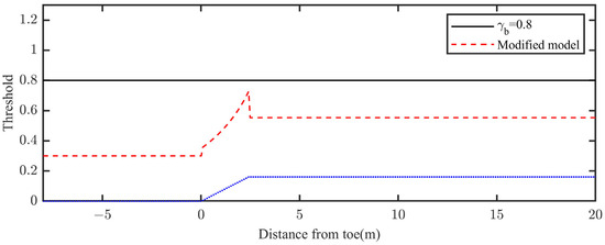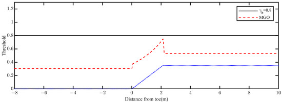 The model was executed for 60 wave periods, and average of the last five waves was used to compute the wave height. For the modified model, the new threshold for the wave breaking criterion was computed by Equation (4); the new threshold and the original threshold (