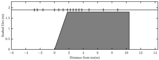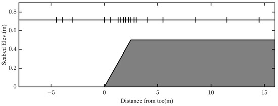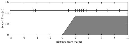 Figure 2 shows a sketch of the experimental bathymetry with the 1:10 slope and wave gauge locations. In this figure, the abscissa represents distance from the toe of the reef, while the ordinate represents seabed altitude and wave gauge locations are labeled with vertical short line on the static water table.