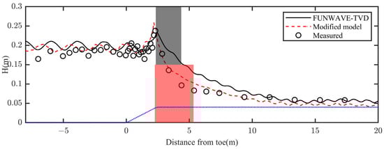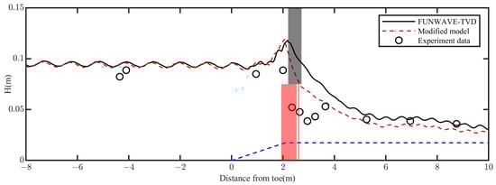 of the original and modified models. It is evident that the original FUNWAVE-TVD model failed to accurately predict the location of wave breaking, with its simulated breaking point lagging significantly behind the observed breaking point. Moreover, the