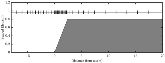 Figure 5 shows a sketch of the experimental bathymetry and the locations of wave gauges, totaling 12. The seaward water depth was 0.45 m, the fore-reef slope was 1:6, and the water depth over the reef flat was 0.1 m. Sponge absorbing layers were installed at both ends of the computational domain. The incident wave was generated by an internal wave maker with a height of 0.095 m and period of 1.25 s. The simulation used a space step of