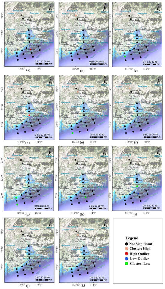 The local spatial patterns of log(Kd) values for metals in the Pearl River Estuary. Subfigures (a–k) illustrate individual metals: (a) Cd, (b) Co, (c) Cr, (d) Cu, (e) Fe, (f) Mn, (g) Mo, (h) Ni, (i) Pb, (j) Tl, and (k) Zn.