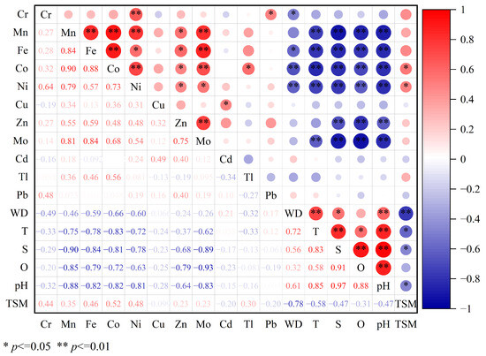 Correlation between log(Kd) values of metals and environmental factors. WD: water depth; T: temperature; S: salinity; O: oxygen; TSM: total suspended matter.
