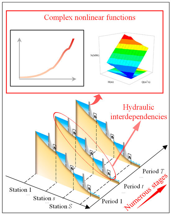 Extreme weather conditions, such as high temperatures and severe cold, coupled with the uncertainty of renewable energy sources, are intensifying the challenges faced by power systems in power supplies [1,2]. According to data from 2023, the load of 30 provincial-level power grids in China reached a new peak, with the maximum load increasing by 50 million kilowatts compared with that in 2022. Cascade hydropower stations, with significant power generation and regulation capabilities, play a crucial role in ensuring the supply reliability and balance of the power grid as a clean energy source [3,4]. However, the short-term optimal scheduling of cascade hydropower stations (STOSCHS) is complicated by factors such as complex nonlinear functions (NLFs), numerous stages, and large variable scales, posing significant challenges when exploring solutions [5,6]. As illustrated in Figure 1, the operational characteristics of hydropower stations give rise to complex nonlinear constraints. The close hydraulic connections between cascades complicate the separation of upstream and downstream segments. The scale of the problem increases exponentially with the number of hydropower stations, and the current demands for refined scheduling necessitate more detailed dispatching timeframes. These factors contribute to challenges related to imprecision, suboptimal solutions, and slow computation. Current existing methods and algorithms struggle to meet the requirements of solution accuracy, optimization depth, and timeliness simultaneously [7,8,9]. Therefore, further research into methods suitable for the STOSCHS is still required.