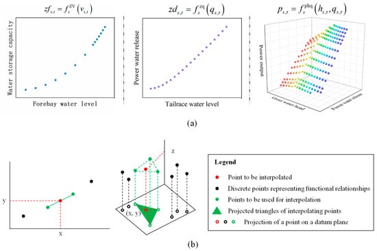 The nonlinear functional relationships for each hydropower station consist of a series of discrete points obtained through practical experiments, which defy precise description by elementary functions. Figure 2a illustrates the discrete points representing the real nonlinear functional relationships of a hydropower station, with particular emphasis on the complexity of the PHQ function. Typically, as the water head increases, the water consumption rate (the amount of water consumed per unit of electricity generated) decreases. However, at the same water head, the water consumption rate exhibits irregular variations as the power water release increases. Hence, precise characterization of these functional relationships is essential. For two-dimensional functional relationships, such as the ZV function and ZQ function, and three-dimensional functional relationships, such as the PHQ function, using piecewise linear interpolation and trigonometric linear interpolation, respectively, can effectively preserve the relationship between experimental data points. Figure 2b demonstrates the method used to obtain function values from these discrete points. Consequently, a nonlinear functional relationship can be delineated by a collection of line segments defined by two adjacent points for a two-dimensional function or by a set of triangular planes defined by three adjacent points for a three-dimensional function. In this study, the nonlinear functional relationships embodied in Equations (17), (18), and (22) are denoted as the ZV segment, ZQ segment, and PHQ grid, respectively.