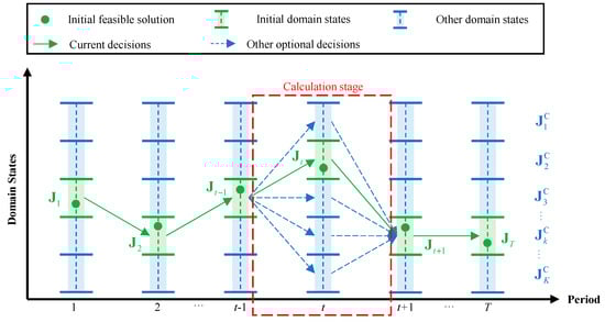 Due to the after-effect of the STOSCHS objective function, it is necessary to consider the states of all of the stages, which can be addressed by the progressive optimality principle. The progressive optimality principle can decompose the complex multistage decision problem into a series of two-stage optimization subproblems and replace the overall solution by successively solving and iteratively updating all subproblems to reduce the solution difficulty. Starting from an initial feasible solution, optimizations for any stage keep the state of the other stages unchanged, and the initial feasible solution updates the results of this stage for the calculation at the next stage. Equation (28) is the optimization objective function of stage .
