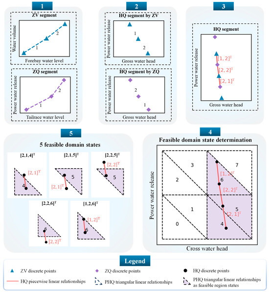 As shown in Equation (26), a dimensional disaster is still unavoidable due to the large number of states at each station. The use of a feasible domain state dynamic acquisition method can effectively reduce the number of domain states for each station before optimization at each stage, thereby decreasing the total number of combinatorial domain states. For the first stage, when the initial forebay water level is determined by Equation (14), there is a piecewise linear relationship between the gross water head and power water release, as shown in Equation (29). This is due to the piecewise linear characteristics of the ZV and ZQ functions, which means that the composite operations and linear combinations of these functions also exhibit piecewise linear characteristics. Figure 4 illustrates a case with 3 ZV discrete points, 3 ZQ discrete points, and 8 PHQ triangles. From Equations (6) and (29), the ZV discrete points and the ZQ discrete points can be converted into the HQ discrete points representing the relationship between the gross water head and the power water release, respectively. The linear transformation enables two sets of discrete points to be synthesized into a piecewise linear relationship, denoted as the HQ segment. If a segment corresponds to the index of the ZV segment and the index of the ZQ segment, then the vector is used as the index of the HQ segment, as shown in the three red segments and their markers in subfigure 3. All feasible domain states can be obtained based on the intersection of the HQ segment and the PHQ grid, and each also corresponds to an index vector , which can determine the corresponding value of Constraints (23)~(25). In the case shown in Figure 4, the three HQ segments intersect with the three triangles in the PHQ grid to acquire the five feasible domain states in subfigure 5.