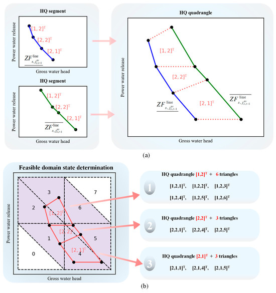 For any stage except the first stage, unlike the initial water level determined during the first stage, the initial water level is an interval under Constraint (23), with the state of stage being . Similar to Equation (29), the boundaries correspond to two piecewise linear relationships, and , as shown by the solid blue and green lines in Figure 5a, respectively. As changes from to , the discrete points on the solid blue line move in a straight line to the corresponding discrete points on the solid green line. The red dotted lines on the right side of Figure 5a are the trajectories of the discrete points, which, together with the solid blue and green lines, form a group of HQ quadrilaterals. Each HQ quadrilateral corresponds to the same ZV segment and ZQ segment , and the index of the HQ quadrilateral is the vector . Figure 5b shows an example of obtaining feasible domain states from HQ quadrilaterals and a PHQ grid. As in the first period, the purple PHQ triangles that intersect the red HQ quadrilaterals can be identified. By combining the index of the red HQ quadrilateral with the index of the purple PHQ triangle , the feasible domain states can be acquired. In the example in Figure 5b, 3 HQ quadrilaterals intersect 6 PHQ triangles, resulting in 12 feasible domain states.