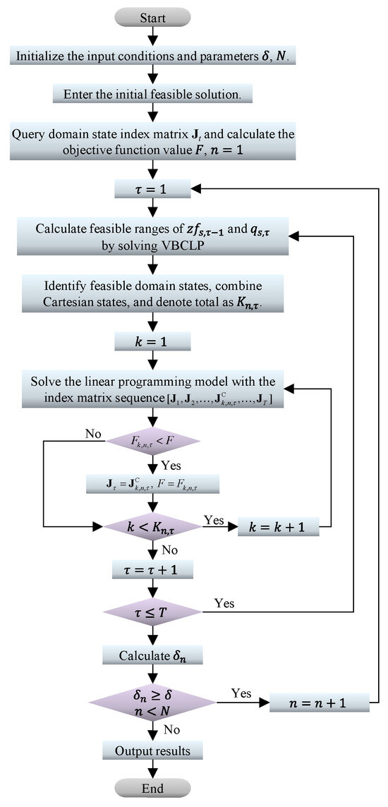 The progressive linear programming optimality algorithm continuously refines decisions and solves linear programming problems iteratively, building upon the initial solution. The algorithm considers the aforementioned combinatorial subdomains of all stations as states, referred to as combinatorial domain states. As shown in Figure 3, the blue index matrix represents the combinatorial domain states to be traversed. Starting from the initial feasible solution, the corresponding initial combinatorial domain states for each stage can be identified, denoted by the green index matrix . During the solution process for stage , takes values from , and the objective function of this decision is optimized. The optimal decision is then obtained by iterating through each . Since the linear constraint corresponding to each combinatorial domain state replaces the nonlinear functional relationship, each decision only needs to solve an efficient linear programming problem, where Equation (3) serves as the objective function subject to Constraints (2), (4)~(15), (21), and (23)~(25). Since each combinatorial domain state represents a continuous space, there is a certain degree of adaptability during the nonoptimization phase in terms of responding to decision adjustments, which can expedite convergence. After all of the solutions are completed, the state of the original feasible solution in stage is updated with the combinatorial domain state of the optimal objective function, indicating the completion of the solution for stage .