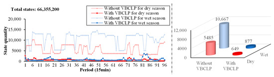 According to Section 3.3.1, the number of feasible domain states is related to the initial water level and the power water release . The area of the HQ quadrilaterals decreases with the decreasing feasible interval of , and the number of HQ quadrilaterals decreases with the decreasing number of feasible discrete points of . Therefore, determining the feasible ranges of and before acquiring the feasible domain states can effectively reduce the number of states and improve the solution efficiency. In this study, a VBCLP model is proposed to solve the feasible ranges of and . The VBCLP objective functions for solving the lower limit and upper limit of the variable for station in period are defined in Equations (30) and (31), respectively.