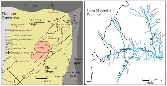 The Yuheng mining area is geologically situated in the central sector of Yulin City, Shaanxi Province, administratively spanning Yuyang District, Hengshan County, and Jingbian County. It occupies the central-western core of the Jurassic coalfield in northern Shaanxi (Figure 1a). The area is bounded by the Yushen mining area to the north, the Yuxi River and the outcrop boundary of the No. 3 coal seam to the east, the provincial border between Shaanxi and Inner Mongolia to the west, and the Yitai-Zhongyin Railway to the south. The Wuding River bifurcates the mining zone into two sub-regions: the Yuheng North Area (38°30′ N to the Wuding River) and the Yuheng South Area (south of the Wuding River to the Taiyuan–Zhongyin Railway).