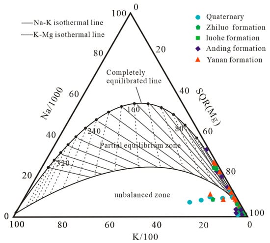 A Na-K-Mg equilibrium map of the Jurassic groundwater in the Yuheng mining area shows that most of the data from the high-mineralization layers fall into some equilibrium zones (Figure 4), indicating strong sealing or weak groundwater circulation and a renewal ability.