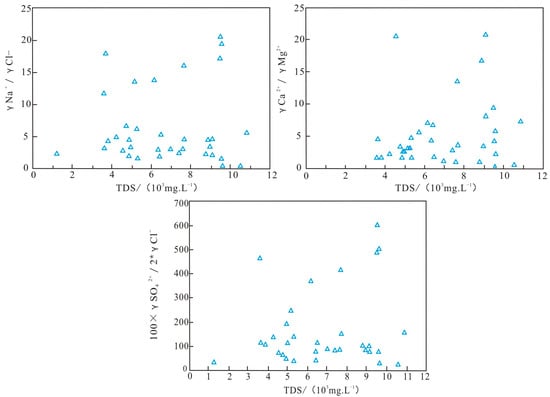 The characteristics of the combination of hydrochemical parameters can reveal the origin of groundwater [19,20,21,22,23,24]; given that the Yan’an Formation is the main layer containing high-mineralization water, this study focuses on an analysis of the characteristics of the combination of the hydrochemical parameters of groundwater samples from the Yan’an Formation. Accordingly, a γCa + Mg/γHCO3 + SO4 value is used to determine the source of groundwater with Ca and Mg. Values greater than one indicate these ions mainly come from the dissolution of carbonate minerals. Values less than one indicate they mainly come from the dissolution of silicate minerals or sulfate minerals, and values equal to one indicate the source of is a mixed dissolution of the two [25,26]. For most of the samples tested in this paper, the value of γCa + Mg/γHCO3 + SO4 is less than one, indicating that the Ca and Mg ions mainly come from the dissolution of silicate minerals or the dissolution of sulfate minerals. The value of the commonly used sodium-chloride coefficient (γNa+/γCl−) indicates the cause of groundwater; for standard seawater, the γNa+/γCl− is 0.85~0.87. The rock salt dissolution and filtration cause of a groundwater γNa+/γCl− is one, the atmospheric water infiltration of a groundwater γNa+/γCl− is greater than one, and the water–rock interactions involving the impact of sedimentary water have a γNa+/γCl− of less than 0.87, according to the paper by Yuheng. In this paper, the stratigraphic water of the Yan’an Formation in the mining area as a whole has a high NaCl coefficient related to water infiltration and leaching, (γNa+/γCl−) (Figure 5). The atmospheric water infiltration leaching of rock salt minerals such as magnetite is directly related to what causes the sedimentary basins of ancient water bodies to concentrate near where the magnetite precipitation of the brackish water stage occurs, which is conducive to the organic matter of a coal formation. The calcium and magnesium coefficient (γCa2+/γMg2+) can reflect the closure of the formation of stratum water, usually the longer the groundwater burial time, the better the closure, the higher the degree of metamorphism, and the greater the calcium and magnesium coefficient. The calcium and magnesium coefficient of deep water is generally greater than three. The calcium and magnesium coefficient of the underground body of the coal mine of the Yan’an group in the Yuheng mining area is higher overall, indicating that the stratum closure is better, which provides a good reduction of the coal-forming environment. The desulfurization coefficient (100γSO42−/2γCl−) reveals the redox environment of deep geothermal water. The reaction of sulfate reduction is very common in groundwater, and the desulfurization effect can reduce sulfate to hydrogen sulfide as the main product. The desulfurization effect occurs in a reduction environment, so the desulfurization coefficient can be used as an environmental indicator, usually the better the groundwater closure, the smaller the desulfurization coefficient. The desulfurization coefficient serves as a valuable environmental indicator due to its dependence on reducing conditions during the desulfurization process. A lower desulfurization coefficient typically reflects better groundwater confinement, as shown by an inverse relationship between these parameters. Our investigation reveals that groundwater samples from the Yan’an Formation coal mine in the Yuheng mining area exhibit significantly higher desulfurization coefficients (Figure 5) compared to regional groundwater averages in the same formation. This elevated coefficient observed in the formation water may be attributed to atmospheric water infiltration and subsequent leaching of sulfate-bearing rocks within the Yan’an Formation.