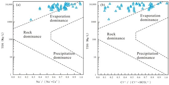 Gibbs [27], through a systematic analysis of the hydrochemical characteristics of different water bodies (oceans, rivers, lakes, atmospheric precipitation, etc.) around the world, concluded that the main factors controlling the source of solutes in the natural surface water and groundwater are rock weathering, atmospheric deposition, evaporation–crystallization etc., of which the designed semi-logarithmic coordinate diagrams can be used to identify the hydrochemical genesis of the water bodies. The groundwater Cl−/(Cl− + HCO3−) in the Yan’an Formation of the Yuheng mining area ranges from 0.09 to 0.98, Na+/(Na+ + Ca2+) ranges from 0.25 to 0.95, and TDS ranges from 1.24 to 36.2 g/L. As can be seen from the Gibbs plot (Figure 6), the distribution of the groundwater data is predominantly in the evaporation-concentration-type intervals in the upper-right corner, which is indicative of the source of the evaporation-crystallization solutes. According to the end-element diagram method proposed by Gaillardet [28], after analyzing the groundwater of the Yan’an Formation in the Yuheng mining area (Figure 7), it can also be observed that the groundwater data of the Yan’an Formation in the Yuheng mining area are mostly distributed in the lower-left corner, indicating that the solute source is mainly related to evaporative rock salt solubility filtration.