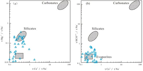 Diagrams of the relationships between Ca2+/Na+ and Mg2+/Na+, Ca2+/Na+ and HCO3−/Na+of ground water in Yan’an Formation of Yuheng mining area (a,b), in northern Shaanxi.