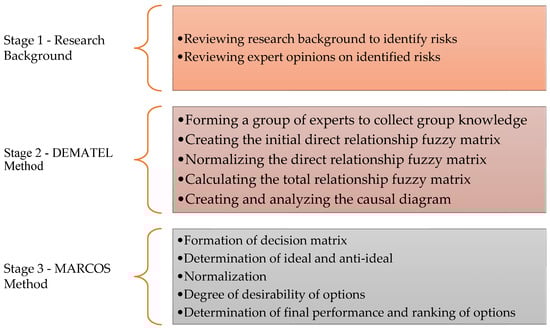 Existing frameworks lack granularity in assessing interdependencies between risk layers (e.g., how welding errors (primary) accelerate corrosion (secondary)). By combining DEMATEL’s causal mapping with MARCOS’s ranking robustness, this study offers a replicable model for quantifying human-centric risks, a necessity underscored by Ernst and Young’s findings [28] that 68% of project failures stem from unmanaged HR risks. The proposed hybrid approach advances the risk management guidelines of PMBOK (Project Management Body of Knowledge) by adding empirical specificity to water infrastructure contexts. In other words, the primary innovation of this research lies in proposing a hybrid DEMATEL–MARCOS model for analyzing human capital risk in water supply projects, integrating primary, secondary, and residual risks. The developed framework simultaneously accounts for the interrelationships among criteria and decision-making behavior, identifying risk factors and evaluation criteria through literature review and expert experience.