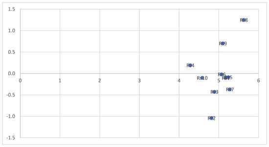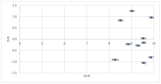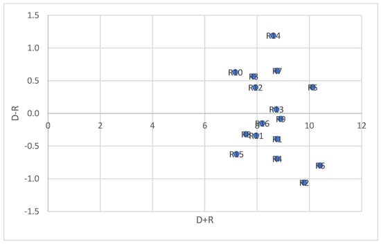 The ranking of the criteria is based on the values of Di + Ri. Finally, a Cartesian coordinate system is plotted, where the longitudinal axis represents the values of D + R, and the transverse axis represents the values of D − R. The position of each factor is determined by a point with coordinates (D + R, D − R) in the system. This results in a graphical diagram (Figure 2).