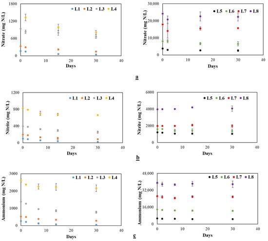 Batch experiments were conducted in a greenhouse using synthetic wastewater prepared according to Kangwannarakul et al. [] as shown in Table S1. The synthetic wastewater was prepared to mimic effluents from a munition manufacturing facility containing very high levels of nitrogen species. The synthetic wastewater was spiked with eight concentration levels (L1–L8) of nitrogen species (nitrate, nitrite, and ammonium) as outlined in Table S2, reflecting typical ranges reported in the literature for the wastewater composition of munition manufacturing facilities (Table S3). In specific, concentrations were designed as 165, 330, 930, 1850, 3800, 8000, 17,800, and 24,200 mg N/L for nitrate, 100, 200, 400, 800, 1200, 1600, 2000, and 4000 mg N/L for nitrite, and 260, 520, 1300, 2600, 5200, 13,800, 26,500, and 39,100 mg N/L for ammonium. Vetiver grass was trimmed and placed in 1 L high-density polyethylene (HDPE) bottles (4% w/v), each containing 800 mL of synthetic wastewater spiked with nitrogen species (Table S2). A control setup without nitrogen was also included. All treatments were performed in triplicate.
