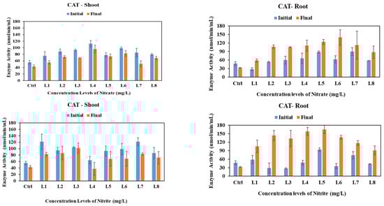 CAT activities in shoots and roots of vetiver grass after exposure to various initial concentrations of nitrate, nitrite, and ammonium. Enzyme activities were analyzed at the initial (day 0) vs. final (day 30) stages of plant exposure to nitrogen.