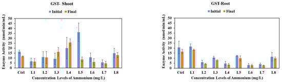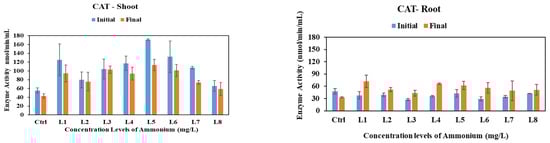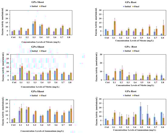 Similar to CAT, GPx is responsible for the breakdown of H2O2 []. As shown in Figure 3, GPx activity in vetiver exhibited distinct patterns in shoots and roots under different conditions. While not statistically significant, GPx levels increased in the shoots across all stressors, while in the roots, GPx decreased under the control conditions and at certain nitrite (L8) and ammonium concentrations (L4 to L8), but increased under other stress conditions, reflecting complex regulation. It is noteworthy that the level of CAT enzyme activity surpassed that of GPx, implying that CAT likely played a substantial role in the breakdown of H2O2.