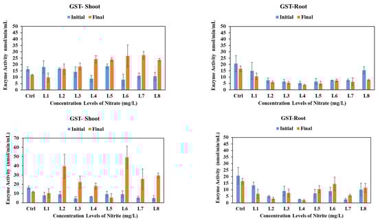 GST activities in vetiver shoots and roots after 30-day exposure to various initial concentrations of nitrate, nitrite, and ammonium. Enzyme activities were analyzed at the initial (day 0) vs. final (day 30) stages of plant exposure to nitrogen.