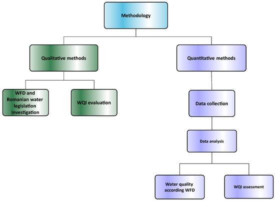 The flowchart of the methodology proposed in this paper is represented in Figure 1. The qualitative methods consist of (i) a discussion based on the specific literature of the Water Framework Directive (WFD) implementation into Romanian legislation related to water quality, its limits, and advantages, and (ii) the water quality index (WQI) method. The results are presented in the Results (Section 3.1). The quantitative methods consist of data collection and analysis, and the determination of water quality is conducted through two methods, WQI index calculation and WFD principle application. The two methods are presented in Section 2.2 Methods. The results obtained will be compared.