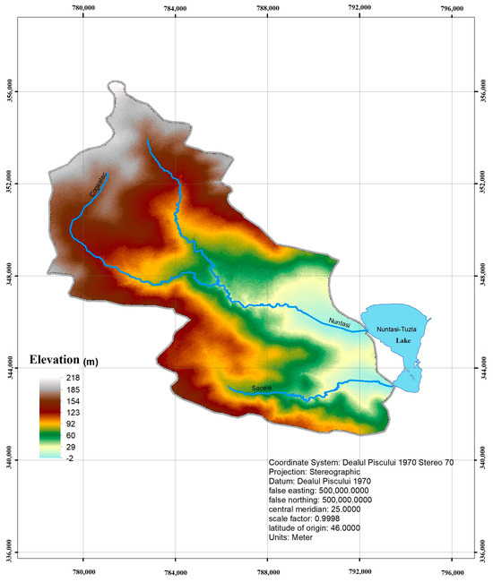 The area studied is part of the Central Dobrogea Plateau, a subunit of the Istrian Plateau, and has a coastal plain aspect (Prispa Hamangia) developed between the Casimcea Plateau and the Black Sea, being a combination of sea plains (Sacele and Chituc), sandy barriers, and shallow lakes (Sinoe, Histria, and Nuntași). The DEM (digital elevation model) is presented in Figure 2.
