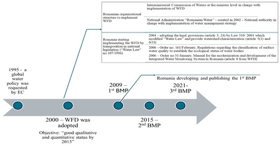 Schematic representation of WFD implementation stages in Romanian legislation. Legend: EC—European Commission, BMP—Basin Management Plan.