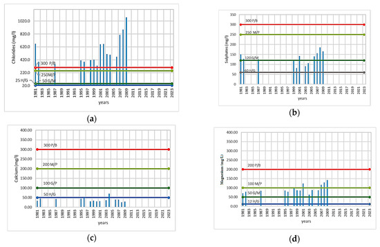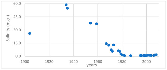 Some historical data related to chloride (Cl−), sulfate (SO4−2), calcium (Ca2+), magnesium (Mg2+), and bicarbonate (HCO3−) are available for different periods (e.g., 1934–1981). These data were collected from different documents [11,12,13,14,15].