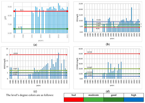 The WFD implementation has had a great influence on the water management systems of EU countries by introducing the concept of watershed management [33]. This was not the case in Romania, which had this concept introduced in the old Water Law no. 8 of March 1974. To assess the ecological state of water, the WFD introduced an integrative method in the evaluation of water quality by establishing its quality based on several biological indicators, at the expense of chemical ones. Appendix V of the WFD outlines a main group as “quality elements”, the biological one and two supporting ones, hydro-morphological and physico-chemical. This principle was implemented in Romanian legislation, as it is explained in the Results section. The use of the principle “one out–all out” leads to a restrictive ecological status classification system in relation to the definition of environmental objectives. It means that a body of water cannot achieve good ecological status if any element has a value that deviates from undisturbed conditions. The big advantage is that if an indicator is missing from a group of indicators, the status could be determined based on the others. For example, as is shown in Figure 6, the DO data series has 31 values registered, BOD5 has 29 values registered, and the CCOMn data series presents some gaps (no values registered for the 2010–2023 period); in this condition, the oxygen regimen status is determined based on DO and BOD5 conditions.